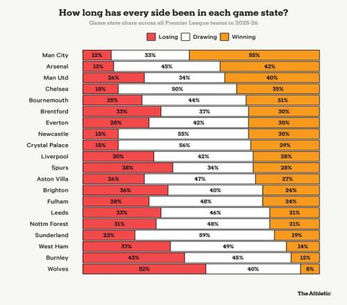 由于未能扩大领先优势,曼联让对手始终保持在比赛悬念中,从而威胁到球队为取得领先所付出的努力。本赛季,曼联在16场英超比赛中有11场能够率先破门,他们在领先局面下度过了40%的比赛时间——这一比例在联赛中仅次于阿森纳(42%)和曼城(55%),位列第三。