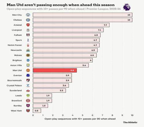 简而言之,曼联在领先时传球不够多。从拥有10次或以上传球的开放进攻序列次数来看,曼联本赛季在领先时每90分钟仅有4.4次,这是英超联赛中第九低的比率。