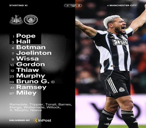 纽卡斯尔联首发:1-波普、3-刘易斯-霍尔、12-马利克-佳夫、4-博特曼、67-刘易斯-米利、39-吉马良斯、41-雅各布-拉姆齐、7-乔林顿、9-维萨、23-雅各布-墨菲、10-安东尼-戈登